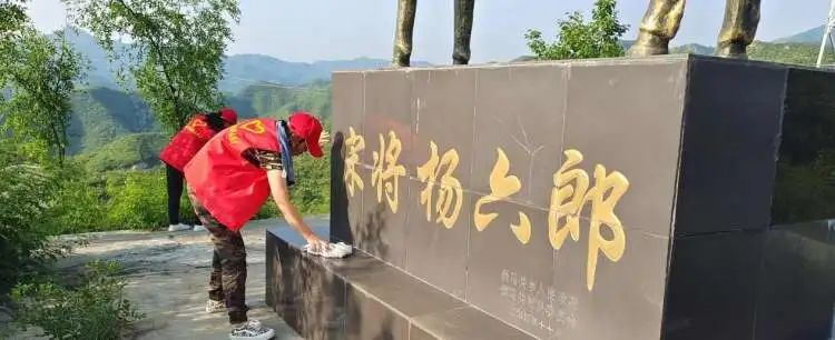 志愿者们满怀崇敬之心,走进崇山峻岭间,手持扫帚、抹布,为宋将杨六郎雕像清扫卫生,细心擦拭铜像,使六郎像焕然一新。