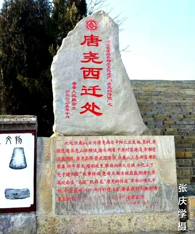 唐尧被迫迁移是逐步的,他是怀着恋恋不舍的沉痛心情,一步一步远离帝都唐城的。首先将帝都搬迁到唐地西部恒山之阳的平阳一带,不久又被暴涨的平阳河水冲毁。接着,往南折返,打算在颖水河畔停下脚步,又再次希望落空,留下了“行唐”县名(因从唐地南行而名“南行唐”,后改称“行唐”)。而后,义无反顾地带领着臣民和族众顺着太行山东麓南下,过灵寿、平山,沿滹沱河谷折西到山西晋阳(即太原)落地,在此建都。由于“名随帝王迁”,山西晋阳、汾水河流域也有跟唐县一带相同或雷同的“唐”、“唐国”、“唐城”、“平阳”、“伊”、“祁”等地名。 另外,《史记·五帝本纪正义》、《明一统志》、《方舆纪要》等文献有“尧从涿鹿迁徙”的记载。笔者认为,它们关于这个问题的记述欠妥,其著述者或者只知道黄帝城的“涿鹿”,不知道唐尧帝都附近的“浊鹿山”;或者因为古籍上“涿鹿”与“浊鹿”通用,致使后人认识上产生了混淆,错把“浊鹿山”当成了“涿鹿”(据说张家口的涿鹿县没有涿鹿山)。即便如此,它们的记载也确实佐证了“帝尧从唐地浊鹿山西迁”的远古历史信息。 2013年9月,河北省人民政府公布“唐尧的传说”获入省级第五批非物质文化遗产名录;唐县人民政府认真落实省政府批文要求,积极实施保护传承工程,在浊鹿山修建了石刻“唐尧西迁处”活化建筑物。