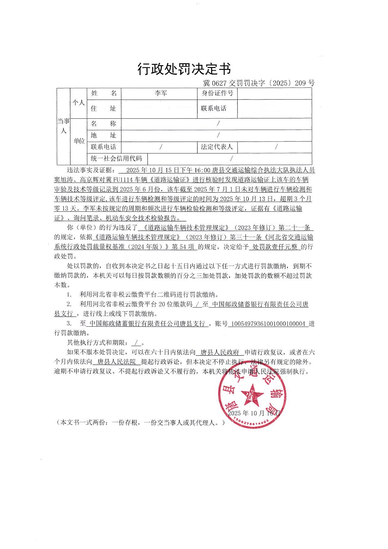 | 冀0627交罚罚决字【2025】209号 | 李军 | 未按规定的周期和... | 罚款 | 2025-10-15 | 唐县交通运输局 | 点击查看 |