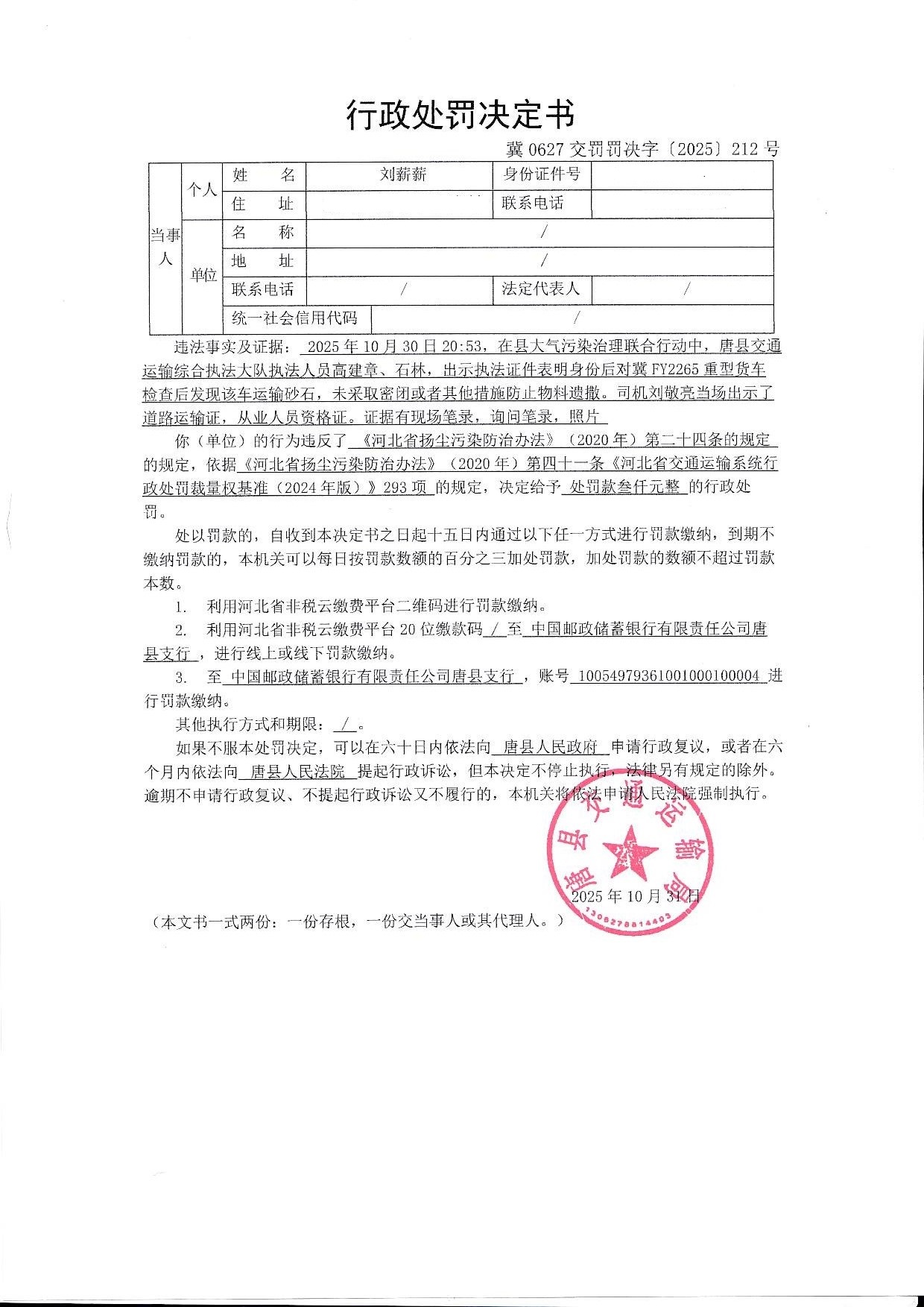 | 冀0627交罚罚决字【2025】212号 | 刘薪薪 | 运输易产生扬尘污... | 罚款 | 2025-10-31 | 唐县交通运输局 | 点击查看 |