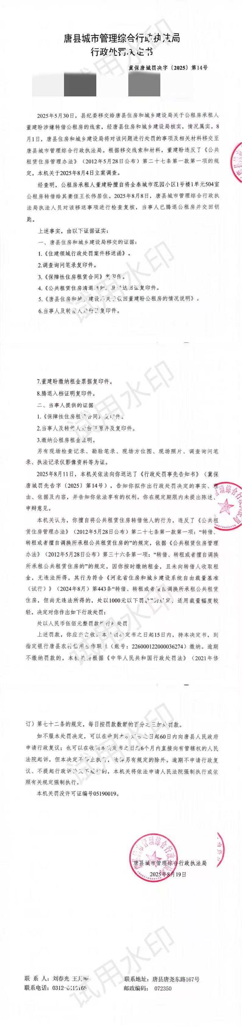 | 冀保唐城罚决字〔2025〕第14号 | 董建盼 | 擅自转借公共租赁... | 罚款处罚 | 2025-08-19 | 唐县城市管理综合行政执法局 | 点击查看 |