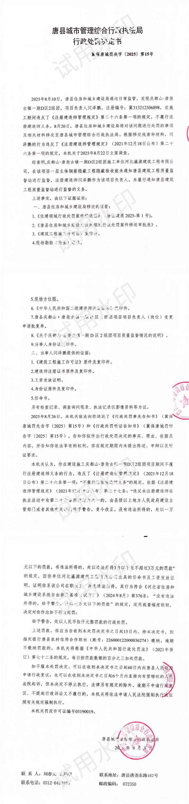 | 冀保唐城罚决字〔2025〕第15号 | 闫泽鹏 | 不履行注册建造师... | 罚款处罚 | 2025-09-03 | 唐县城市管理综合行政执法局 | 点击查看 |