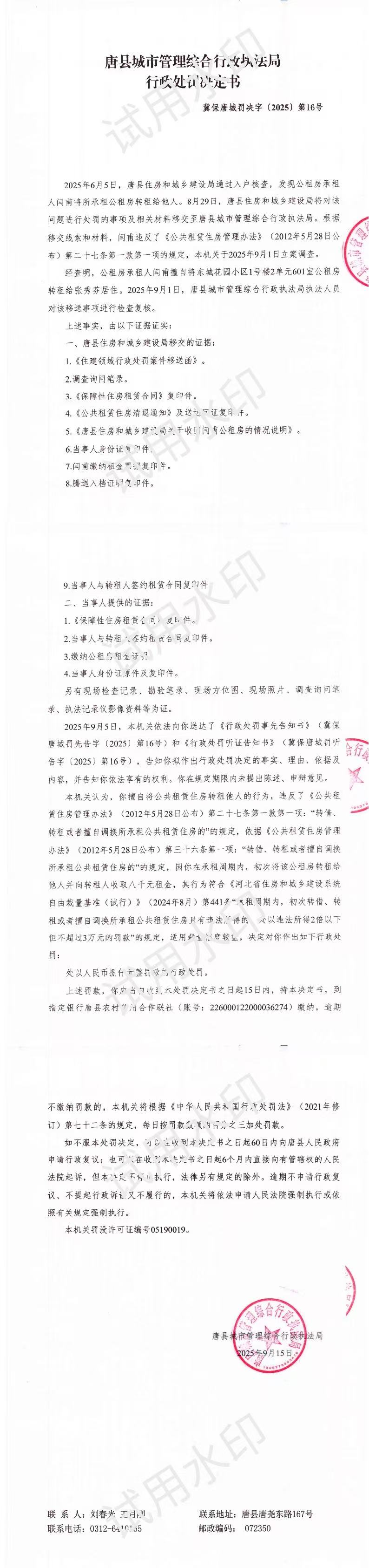 | 冀保唐城罚决字〔2025〕第16号 | 闫甫 | 擅自转租公共租赁... | 罚款处罚 | 2025-09-15 | 唐县城市管理综合行政执法局 | 点击查看 |