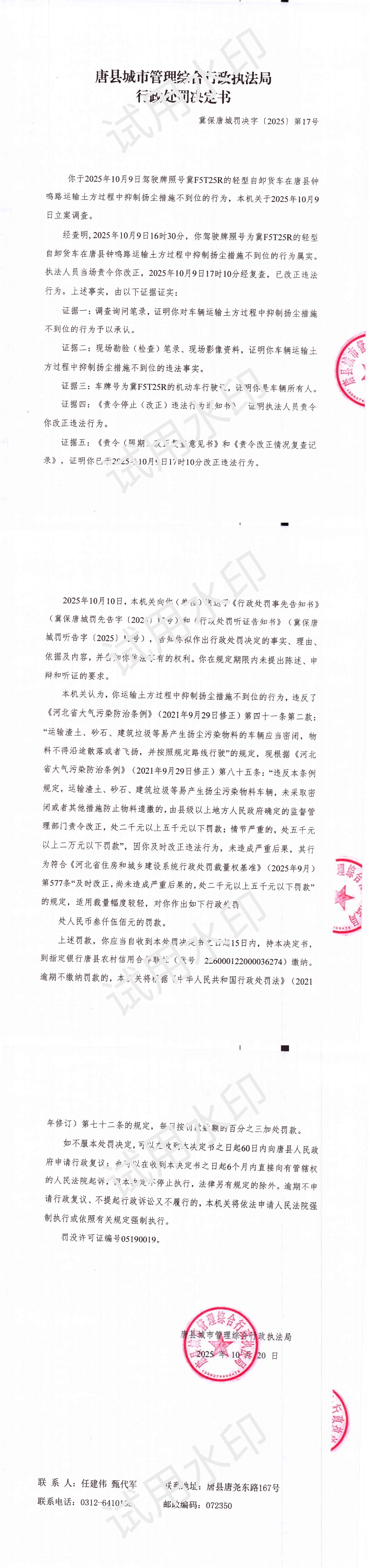 | 冀保唐城罚决字〔2025〕第17号 | 张崇威 | 运输土方过程中抑... | 罚款处罚 | 2025-10-20 | 唐县城市管理综合行政执法局 | 点击查看 |