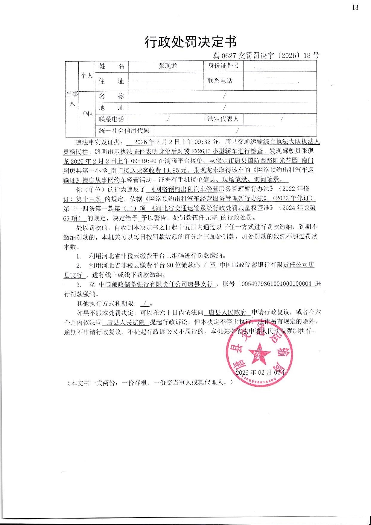 | 冀0627交罚罚决字【2026】18号 | 张现龙 | 未取得《网络预约... | 罚款 | 2026-02-02 | 唐县交通运输局 | 点击查看 |