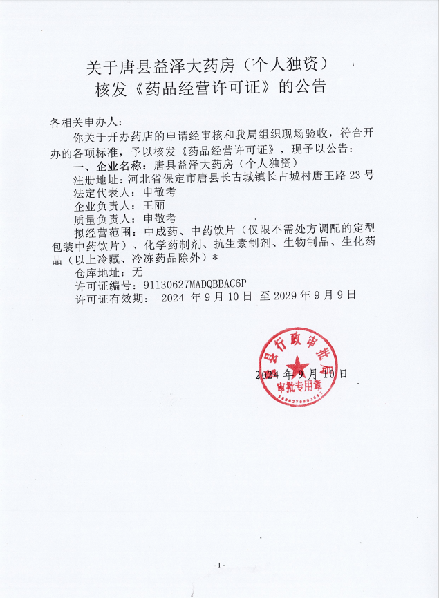 唐县行政审批局关于唐县益泽大药房(个人独资)核发《药品经营许可证》的公告