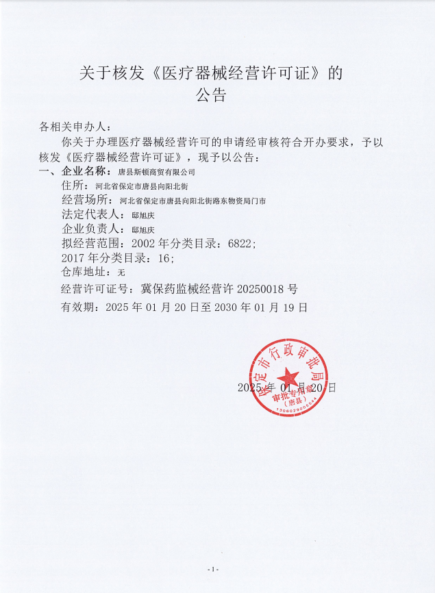 唐县行政审批局关于核发《医疗器械经营许可证》的公告