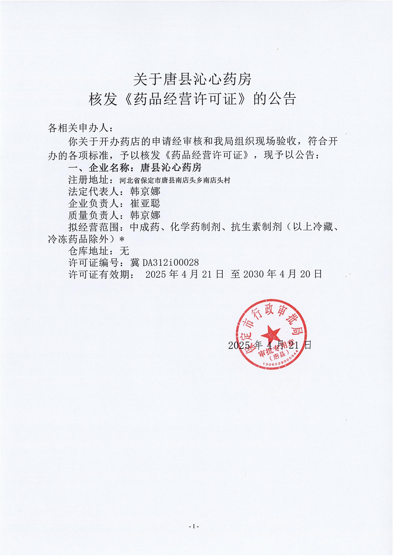 唐县行政审批局关于唐县沁心药房核发《药品经营许可证》的公告