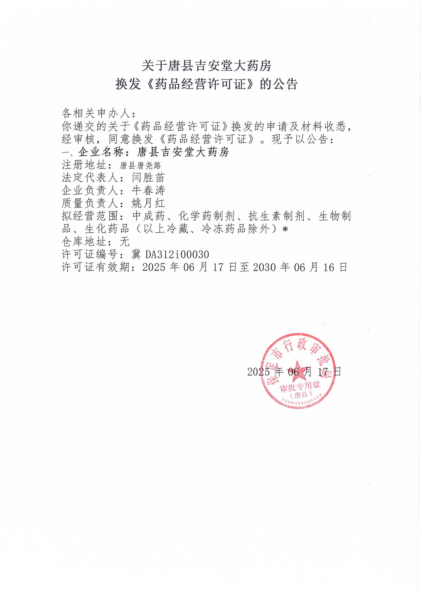 唐县行政审批局关于唐县吉安堂大药房换发《药品经营许可证》的公告