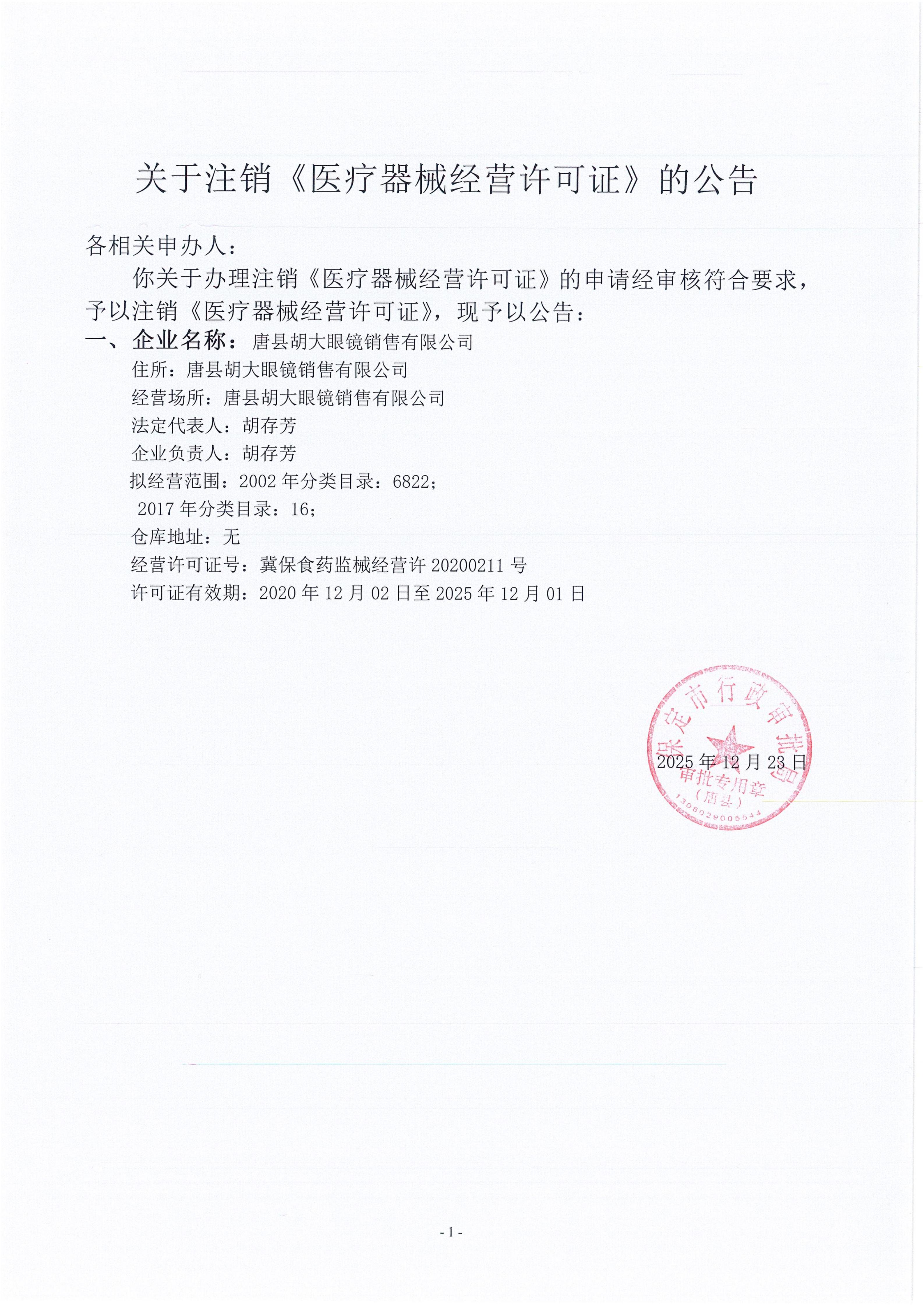 唐县行政审批局关于注销《医疗器械经营许可证》的公告