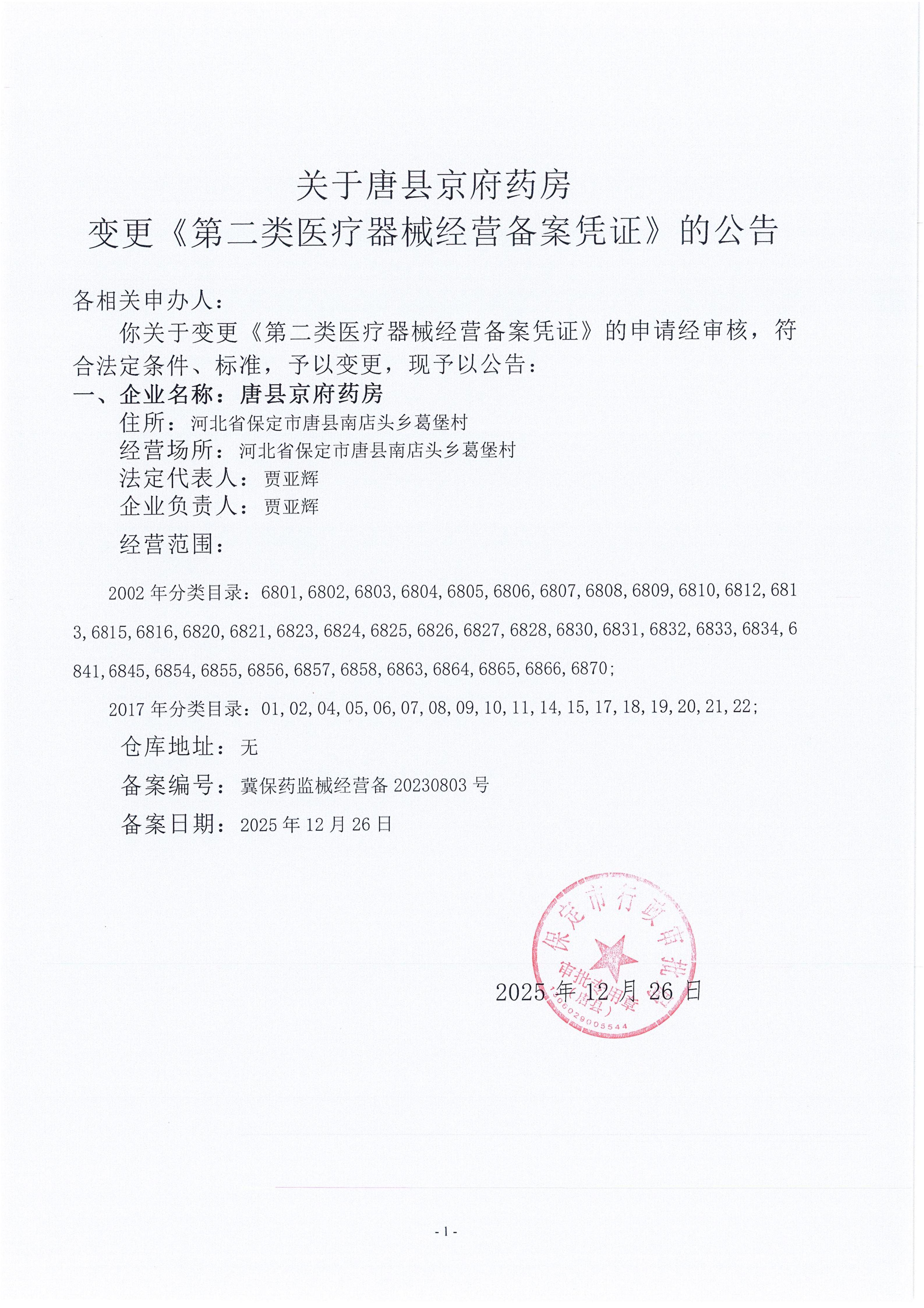 唐县行政审批局关于唐县京府药房变更《第二类医疗器械经营备案凭证》的公告