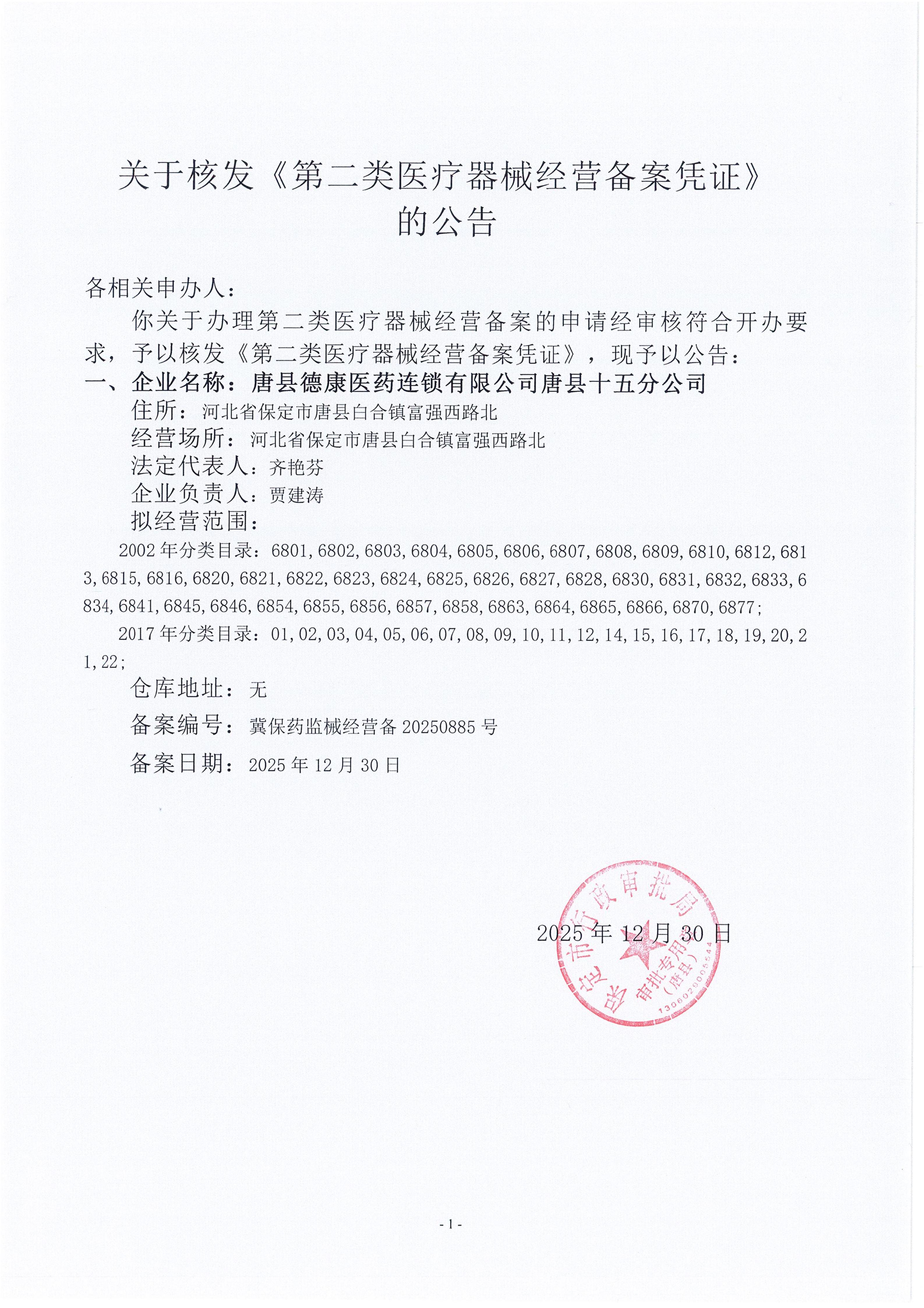 唐县行政审批局关于核发《第二类医疗器械经营备案凭证》的公告